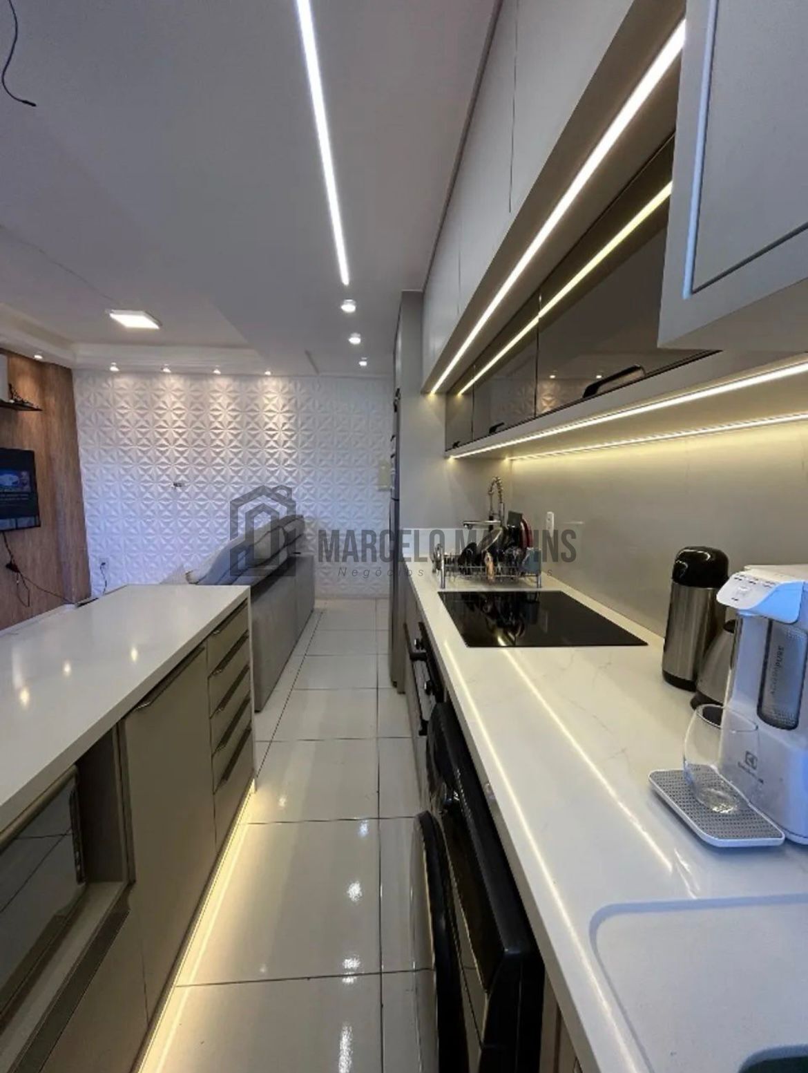- Cozinha mobiliada com móveis planejados, bancada em quartzo Calacatta Gold e cristaleira iluminada