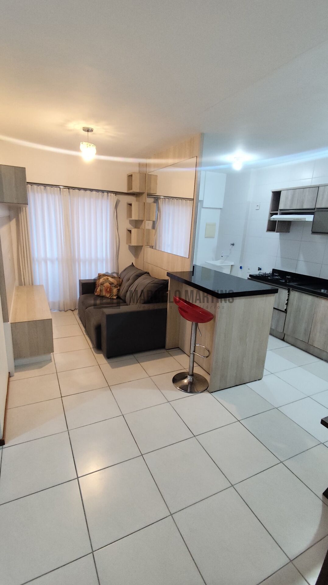 Sala de estar e cozinha integradas;